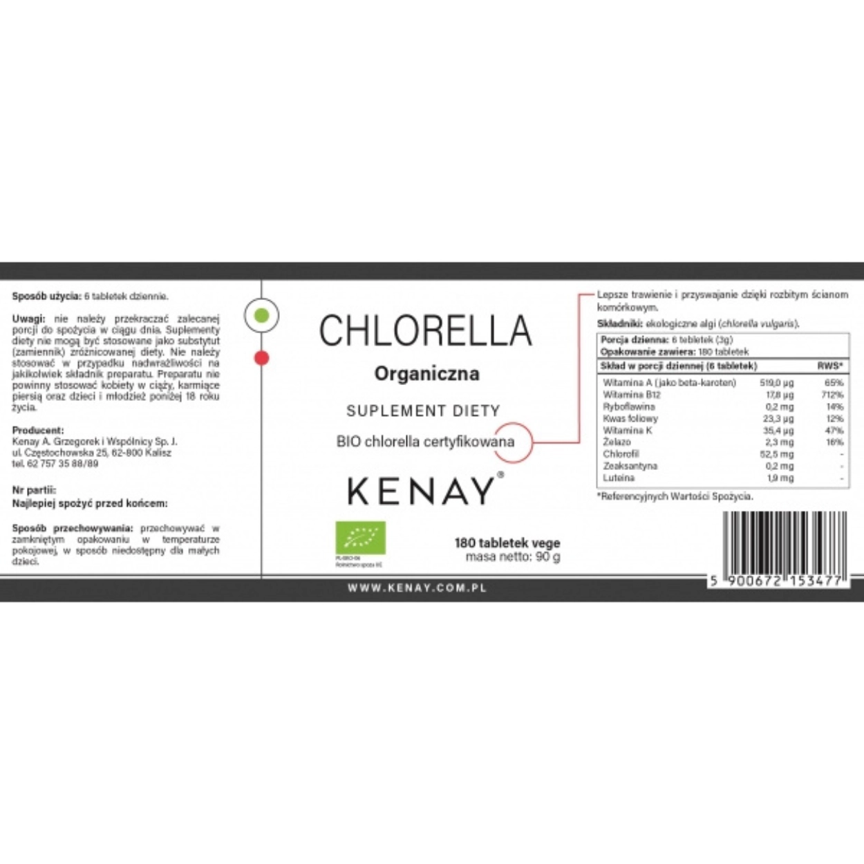 Kenay Chlorella Organiczna 180 tabletek – 90 g | BIO chlorella z rozbitymi ścianami komórkowymi