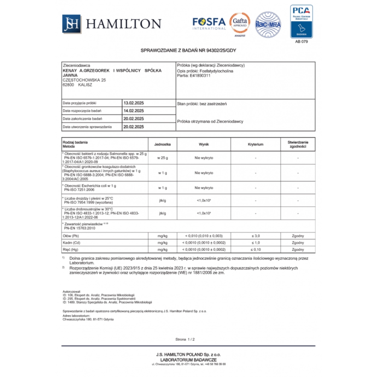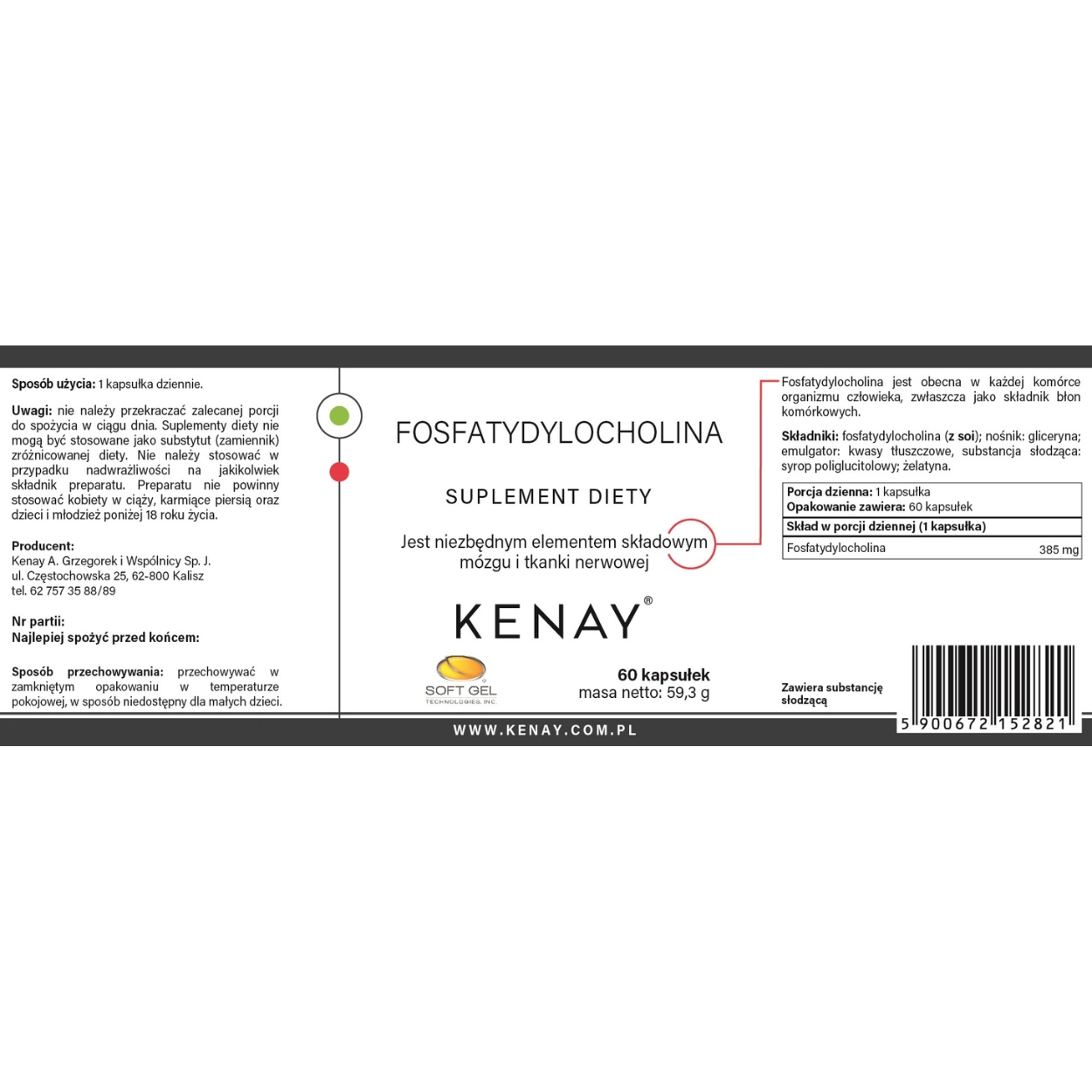 Fosfatydylocholina to związek naturalnie obecny w komórkach organizmu, szczególnie w błonach komórkowych. Producent podkreśla, że jest ważnym elementem składowym mózgu i tkanki nerwowej. W tym produkcie zastosowano fosfatydylocholinę pochodzącą z soi. [oai_citation:1‡Kenay](https://kenay.com.pl/392-fosfatydylocholina-60-kapsulek.html)